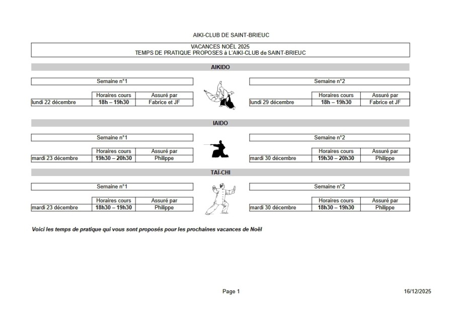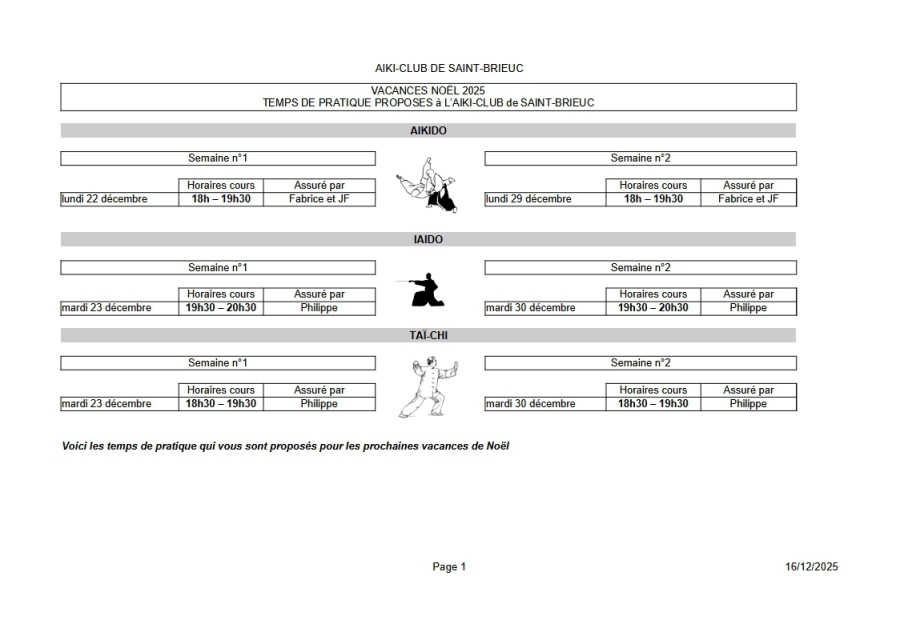 Cours proposés pendant les vacances de Noël